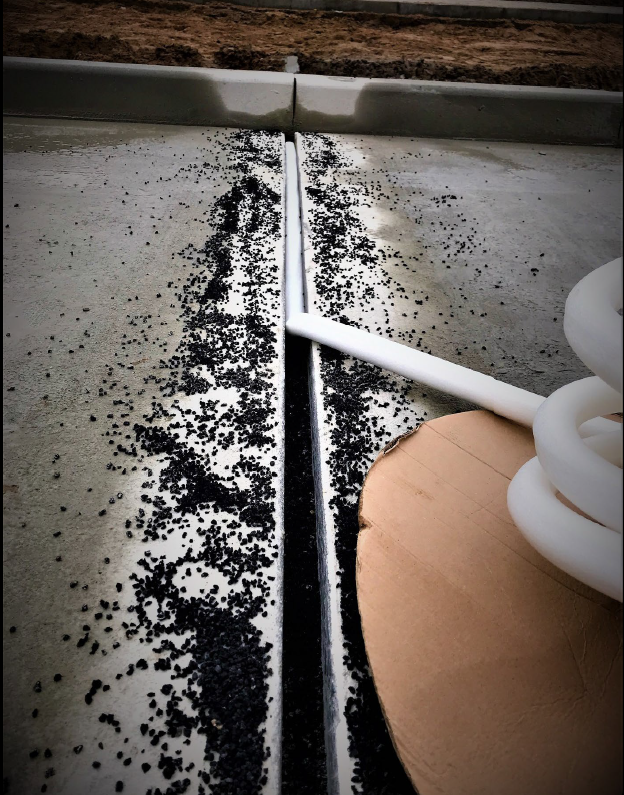 - шнур укладывается поверх предварительно засыпанной и уплотнённой резиновой крошки 2–4 мм;